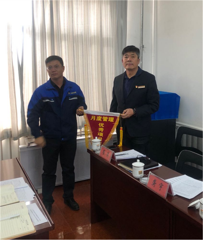 城建公司副總經(jīng)理龔宇為第二名頒發(fā)《月度管理優(yōu)秀項(xiàng)目部》榮譽(yù)稱(chēng)號(hào)(圖左城建公司副總經(jīng)理吳?。粓D右項(xiàng)目經(jīng)理付文寧)