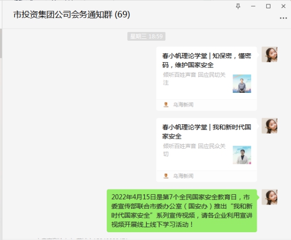 2022年4月15日是第7個全民國家安全教育日,4月7日上午,市城投集團公司通過多種形式組織職工觀看了市委宣傳部聯(lián)合市委辦公室(國安辦)推出的“我和新時代國家安全”、“知密碼、懂密碼,維護國家安全”系列宣傳視頻。