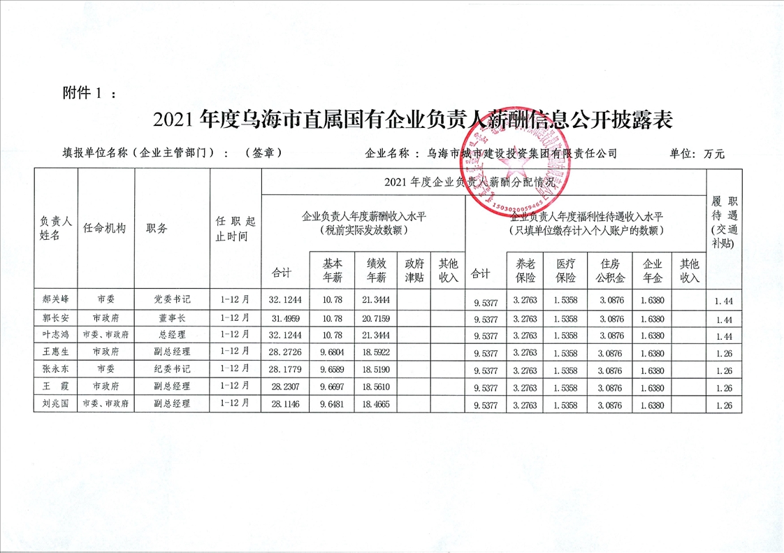 - 2024-06-18烏海市城市建設投資集團有限責任公司企業(yè)負責人2020年度至2022年度任期激收入信息公開披露表