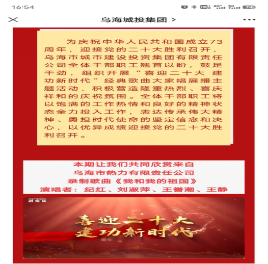 在黨中央確定今年下半年召開黨的二十大之后,市城投集團公司將喜迎黨的二十大作為2022年思政宣傳工作的重要主線,將其貫穿到企業(yè)經(jīng)營和生產(chǎn)服務工作全過程,組織策劃喜迎二十大系列活動,先后開展市城投集團公司“踔厲奮發(fā)新征程,迎接黨的二十大”我們的節(jié)日?中秋主題活動,組織黨員干部職工觀看紅色影片,組織開展“喜迎二十大 建功新時代”經(jīng)典歌曲大家唱展播活動,各子公司營業(yè)廳、辦公樓等場所張貼懸掛喜迎黨的二十大宣傳標語等,進一步統(tǒng)一思想、凝聚共識、匯聚力量,在干部群眾中引起熱烈反響,全面營造迎接黨的二十大的濃厚氛圍,以實際行動迎接黨的二十大勝利召開。