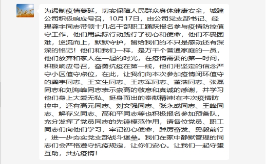 城建公司黨支部對(duì)本次在疫情防控值守中挺身而出、沖鋒在前的志愿者同志進(jìn)行表揚(yáng),并號(hào)召全體黨員向他們學(xué)習(xí),牢記初心使命,踔厲奮發(fā)、勇毅前行,進(jìn)一步夯實(shí)黨支部戰(zhàn)斗堡壘。
