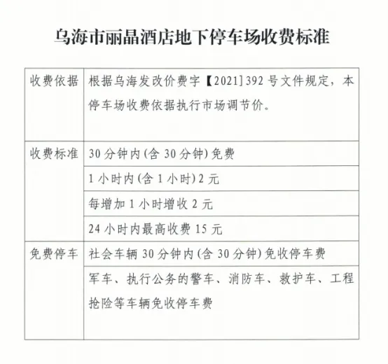 為緩解地面停車壓力,引導(dǎo)車輛有序停放,烏海市濱河九中地下停車場(chǎng)與麗晶國(guó)際酒店地下停車場(chǎng)已完成智能化升級(jí)改造。2024年7月25日經(jīng)海勃灣區(qū)城市管理綜合執(zhí)法局批準(zhǔn),兩個(gè)停車場(chǎng)于近期正式開展停車收費(fèi)管理,收費(fèi)標(biāo)準(zhǔn)見下表: