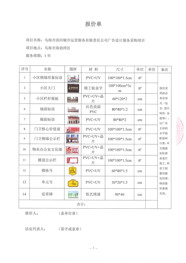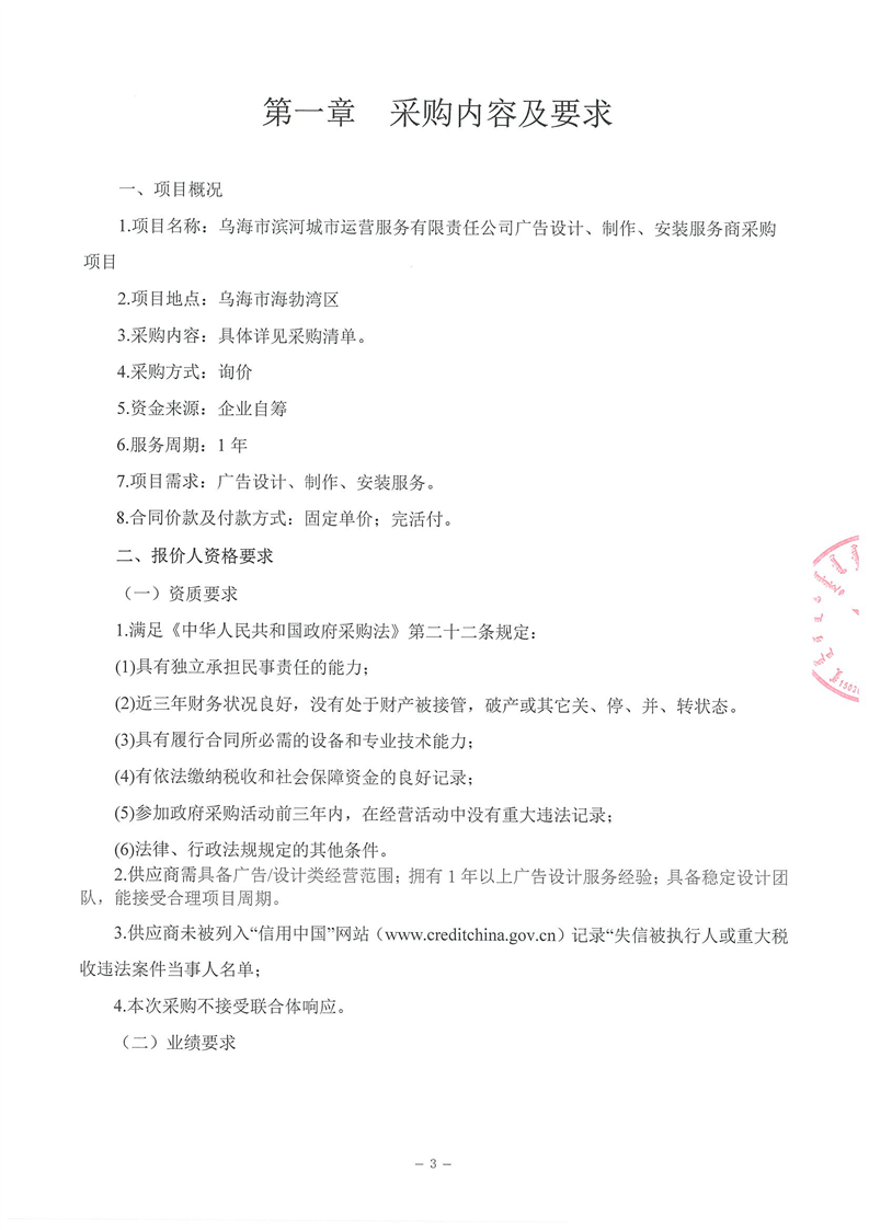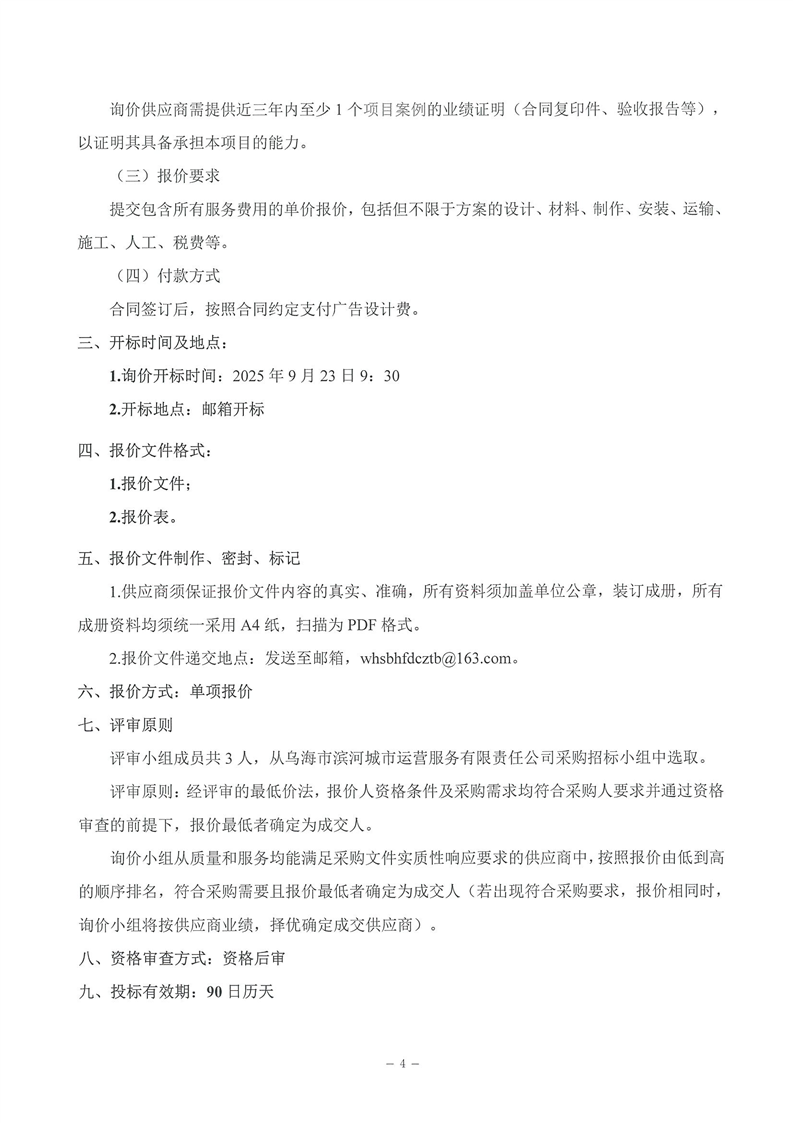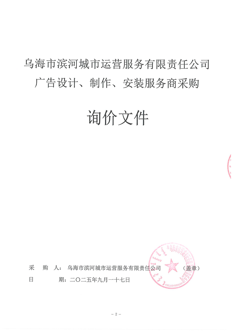 烏海市濱河城市運(yùn)營(yíng)服務(wù)有限責(zé)任公司廣告設(shè)計(jì)、制作、安裝服務(wù)商采購(gòu)詢價(jià)文件