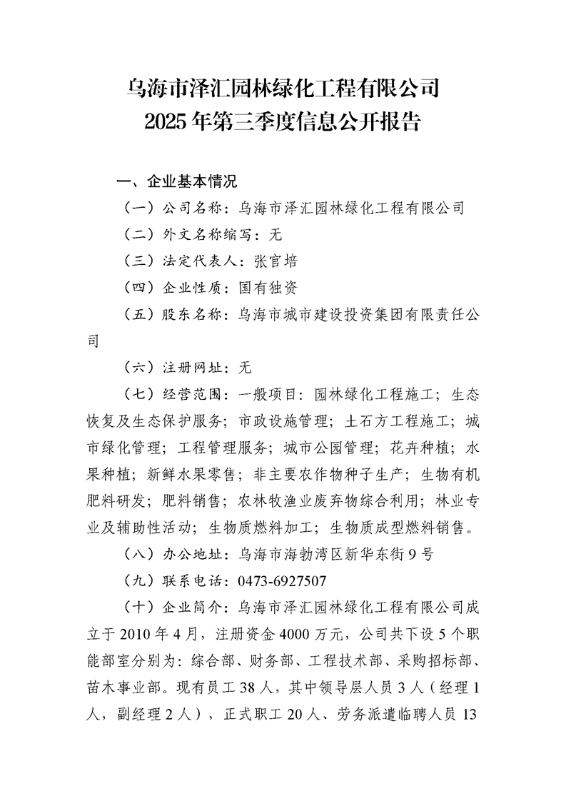 - 2025-03-10烏海市澤匯園林綠化工程有限公司2024年度信息公開報告