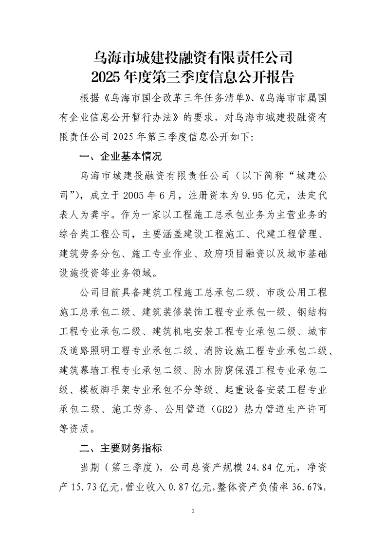 - 2025-04-22烏海市城建投融資有限責任公司2025年度第一季度信息公開
