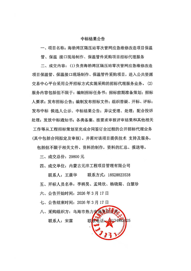 海勃灣區(qū)隔壓站零次管網(wǎng)應(yīng)急維修改造項目保溫管、保溫 接口現(xiàn)場制作、保溫管件采購項目招標(biāo)代理服務(wù)(結(jié)果公告)